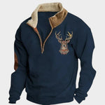 Le design comprend un col haut avec fermeture éclair, des renforts en cuir synthétique aux coudes et un brodé de cerf tribal sur la poitrine, offrant une touche rustique et originale.